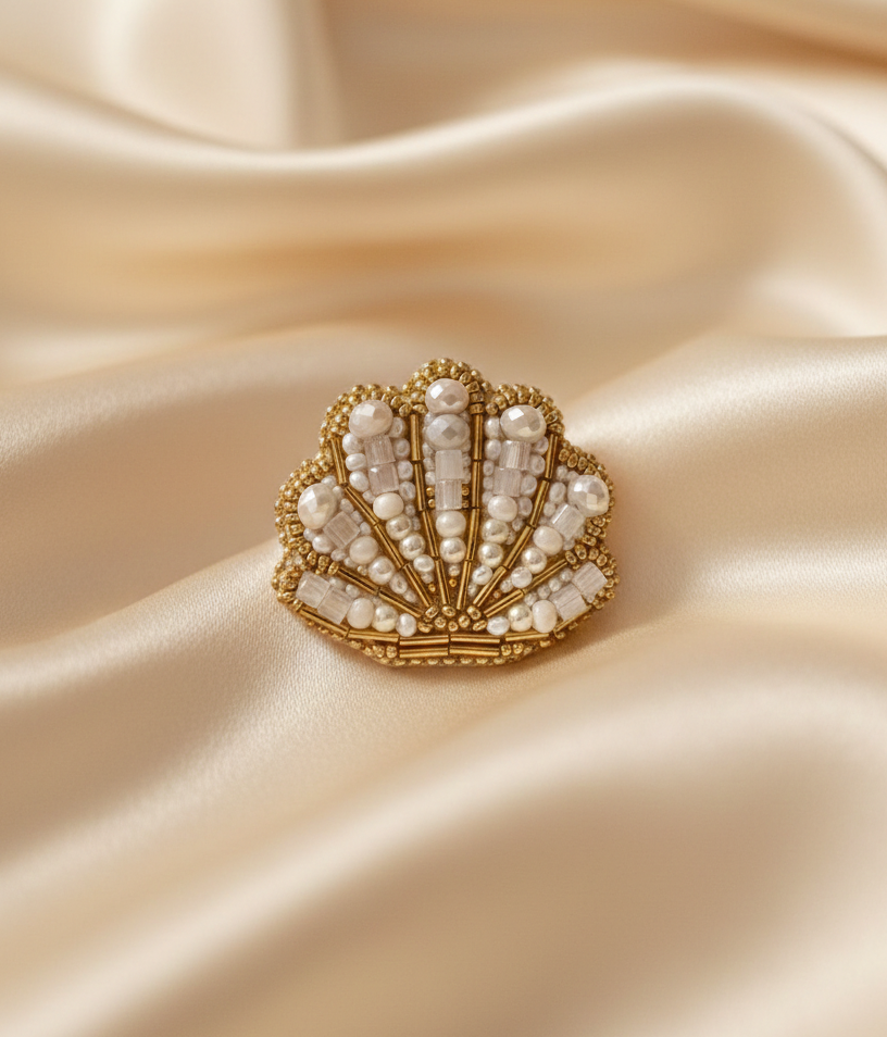 Es un broche de concha bordado a mano con mostacillas checas, canutillos, perlas de río y cristales.