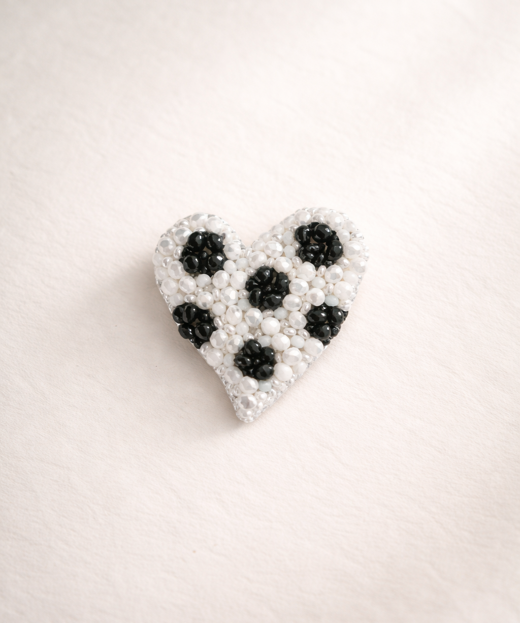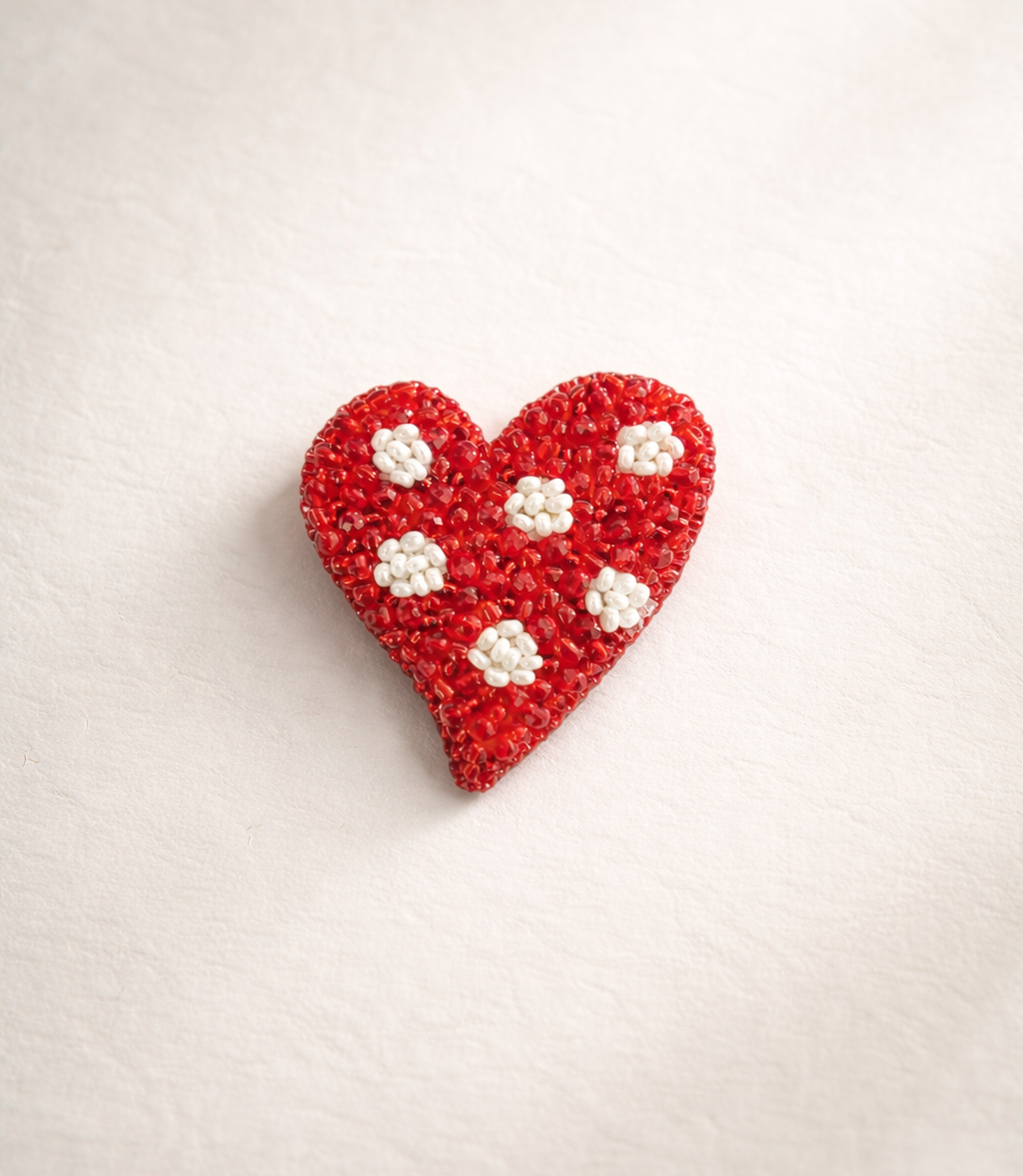 Es un broche de corazón con lunares confeccionado con cristales y mostacillas checas. Su cierre es en acero inoxidable y la aguja no daña la ropa.