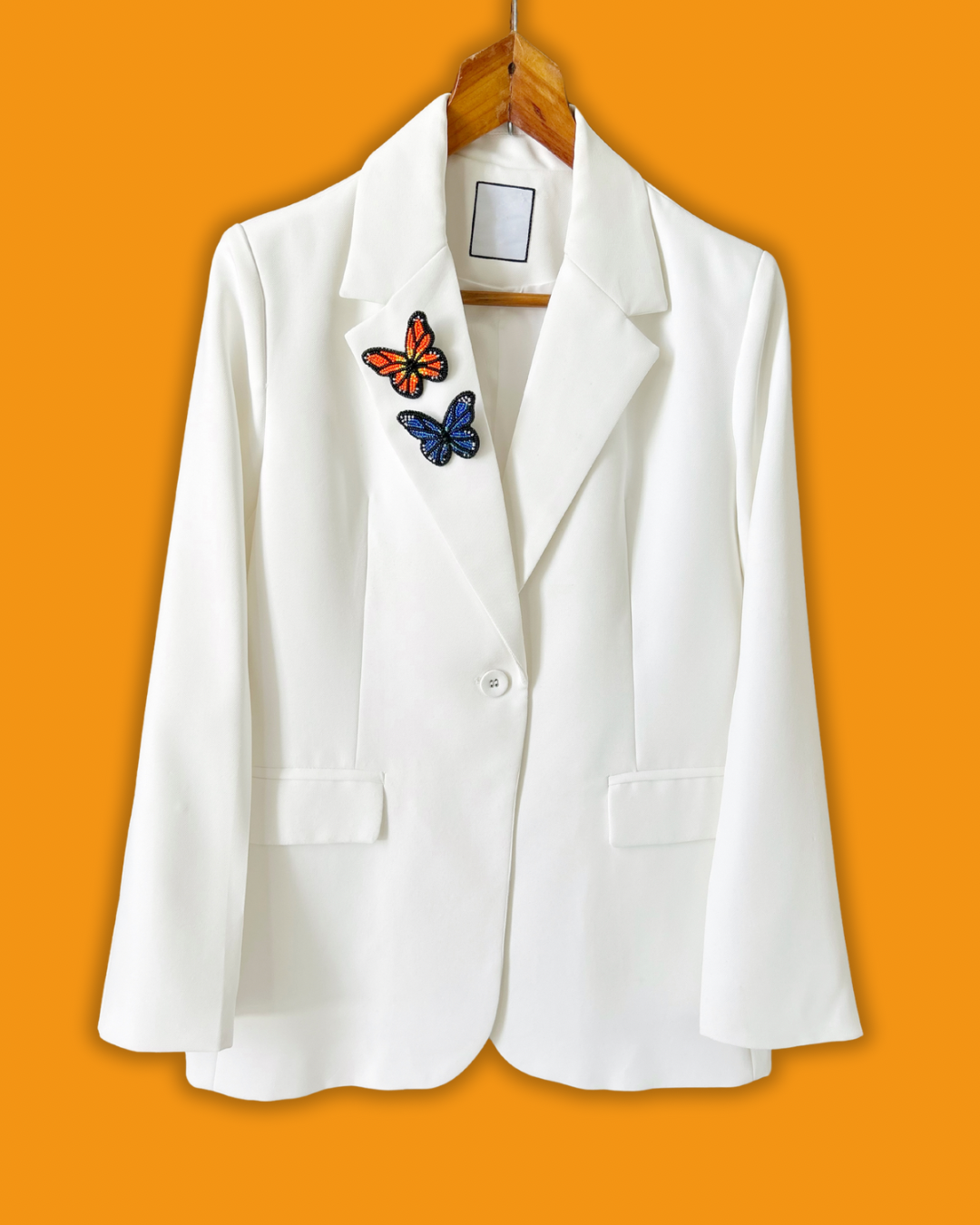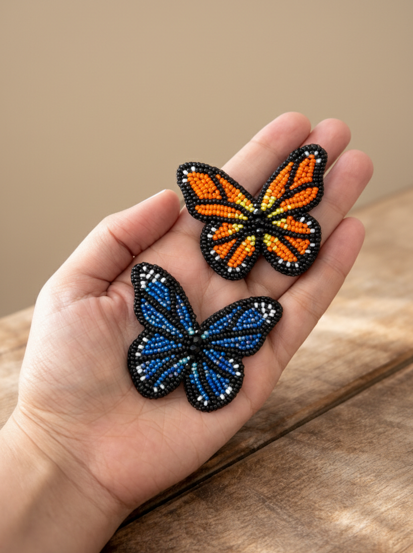 Es un broche de mariposa monarca hecho a mano bordado con mostacillas checas y cristales. Su cierre es en acero inoxidable y la aguja no daña la ropa.
