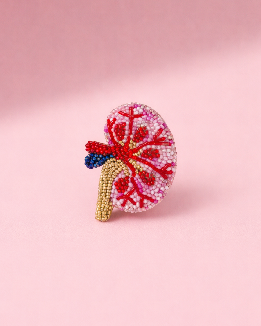 Es un broche del riñón bordado con mostacillas checas y canutillos. Su cierre es en acero inoxidable y la aguja no daña la ropa.